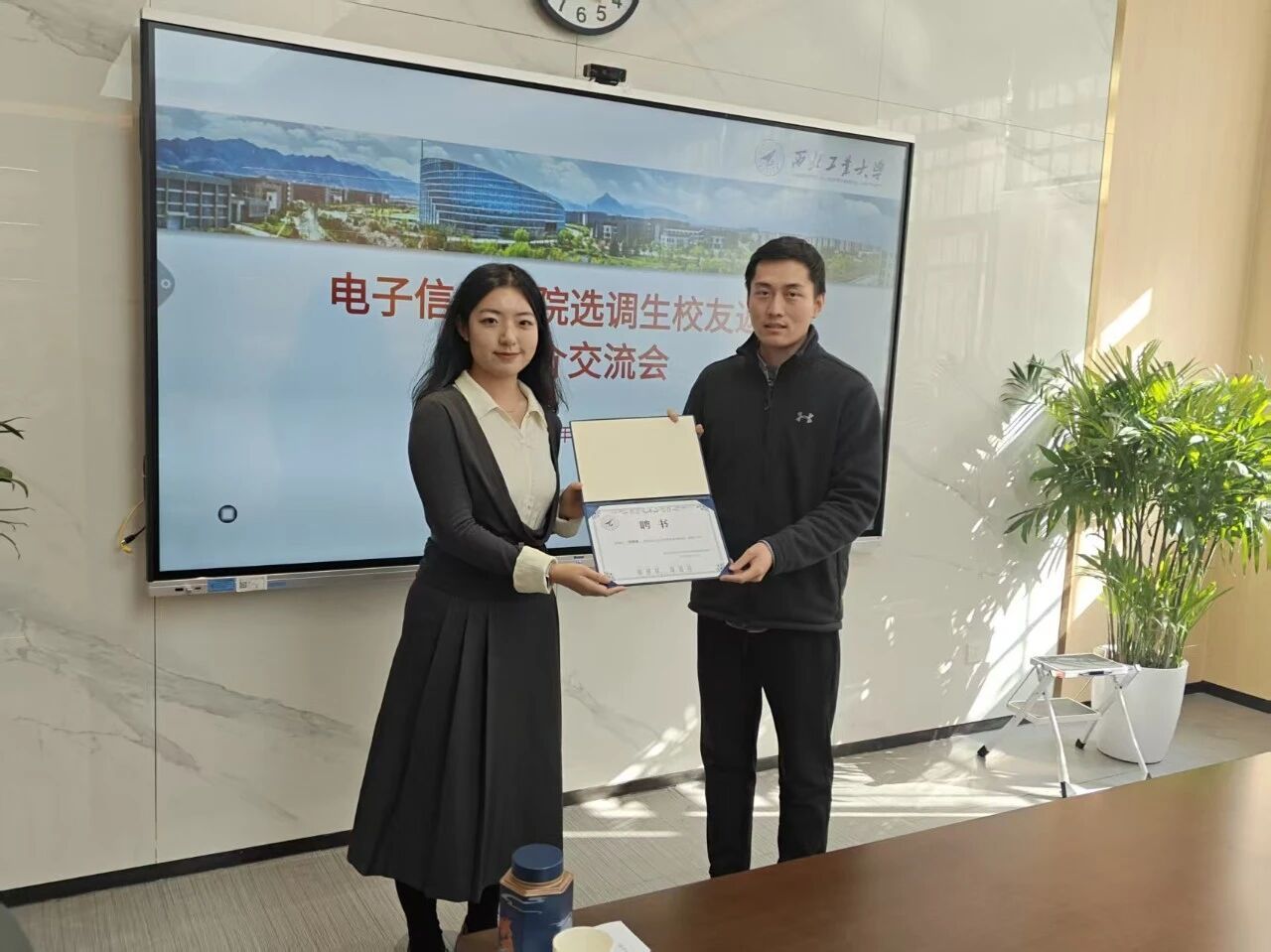 活动伊始,史越介绍参会人员,代表学校聘任何明遥、何飞龙为英国上市公司官网365校外职场导师,并赠送纪念品。在随后的校友发言中,何明遥以扎根北疆沃土,践行工大精神为题从三个方面与大家进行交流分享,从母校理论课程的系统学习、工程实践的深入参与,到科技一线,掌握各级科技政策,持续提升创新意识和业务工作能力,再到扎根基层乡镇,走向广袤田野,和村干部一同入户,讲政策、听意见、找办法、解难题。她始终铭记母校“公诚勇毅,三实一新”的校训,勇担责任、砥砺前行,向下扎根、向上生长,用奋斗诠释初心,努力交出一份属于西工大人的时代答卷。何飞龙则从具体选调生问题出发,以自身见闻出发,更加具体地回答同学们所遇到的问题。