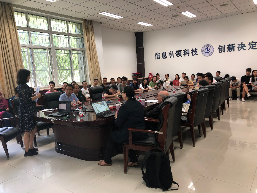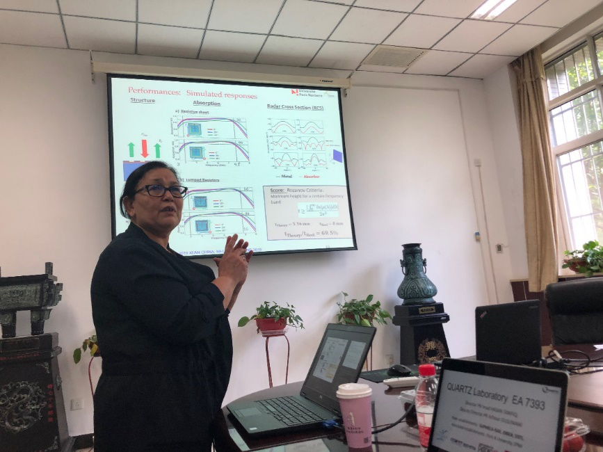 Habiba教授介绍了基于超材料的吸收器(MA),其中心频率约为8~10GHz,带宽为3~4GHz,工作在雷达带宽。该吸收器结构实现了低轮廓,其可以达到非常接近理论极限的厚度值。在垂直入射下可获得整个带宽中大于90%的吸收率。与会师生与Habiba教授就目前基于超材料吸收器的结构设计问题展开了热烈的讨论,了解了均衡器-驱动器的最新研究方向,并就这一议题与Habiba教授进行了积极的研讨,并对Habiba教授的精彩报告表示了诚挚的感谢。