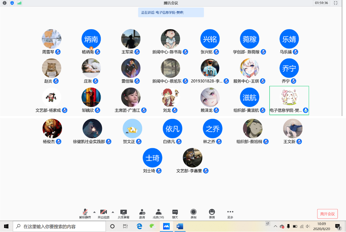 为更好的开展学生会的各项工作,满足学院改革发展的需要,英国上市公司官网365英国上市公司官网365团委学生会本着自我教育、自我管理、自我服务的原则,于8月20日召开2020-2021学年部门改革讨论与工作安排线上会议,讨论了新学年各部门工作规划与发展构想并提出了创新性意见与建议,力争在新学年做到以正确的方向引导人,以健全的制度塑造人,以丰富的活动锻炼人,以优质的工作服务人。参会人员包括英国上市公司官网365团委书记樊晔、团委副书记刘畅、学生会主席杨炳南、服务中心主任贺文正、学生会副主席广浩江、赵炎,团委学生会各部部长干部。