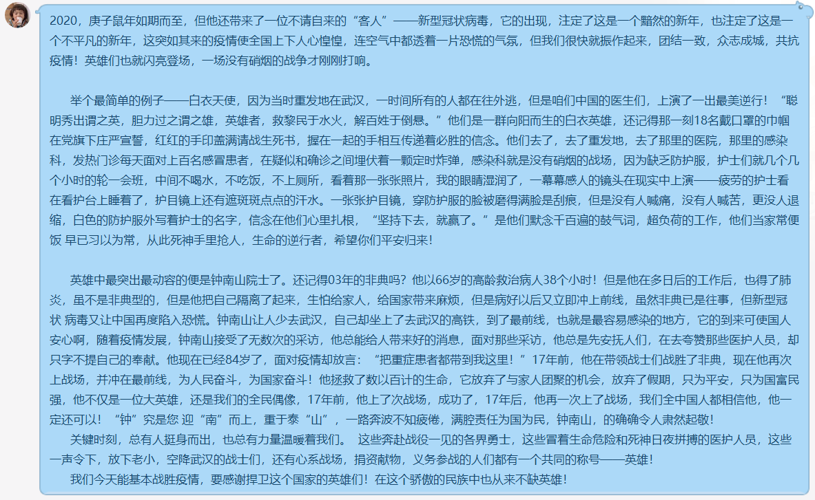 在忙碌的金银潭医院中,总有一个佝偻的背影,他就是张定宇院长,年过五旬的他身患渐冻症,妻子在好几十公里外的医院因感染新冠病毒隔离治疗。每天凌晨两点入睡,凌晨四点就起床工作,在急诊楼中,他穿着白大褂穿梭于各个病房之间,眼镜上沾着水珠,混着雾气。他那已经发病的双腿,走路颤颤巍巍地;脱下口罩,脸上的勒痕清晰可见;他那被消毒水浸的一块一块往下掉皮的双手;他坚守抗疫一线的背影,是中华民族的脊梁;他默默无闻工作后的汗水,是人民幸福与快乐的源泉。最后,让我再一次向在抗击新型冠状病毒肺炎疫情战斗中的勇士们,以及幕后的后勤保障、科研研发的英雄们,说一声“谢谢”,致以最崇高的敬意。