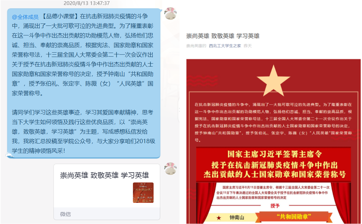 为了鼓励大家学习在抗击新冠肺炎疫情的斗争中所涌现出的先进典型,英国上市公司官网3652018级本科F1岗辅导员樊晔开设了一期【品德小课堂】。“品德小课堂”是英国上市公司官网365“1+5+X”的学生价值塑造培养体系中的举措之一,教育引导学生坚定理想信念、厚植爱国主义情怀、加强品德修养、增长知识见识、培养奋斗精神、增强综合素质,努力培养德智体美劳全面发展的社会主义建设者和接班人。本期“品德小课堂”带领同学们学习在抗击新冠肺炎疫情的斗争中的英雄事迹,学习其爱国奉献精神,并引导学生思考当下大学生如何领悟及践行这些优良品质。