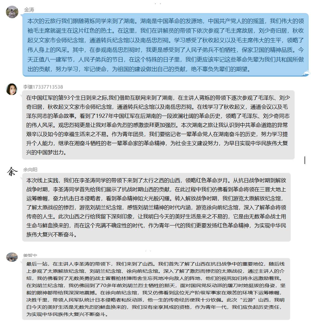 今年的8月1日是中国人民解放军建军93周年纪念日。我们通过这两次实践,再次加深了同学们对中国共产党领导下人民战争的理解。党对人民军队的绝对领导,是人民军队的建军之本、强军之魂。人民军队在党的旗帜下前进,理想信念的火种代代赓续,红色传统的基因一脉相传。对此,同学们展开了热烈的讨论: