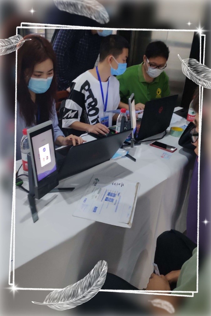 新生首先来到内场注册地点处,通过人脸识别与身份信息以及录取信息核对进行报到。同时领取一卡通、选课手册等物品以及口罩和手套等防疫物资。
