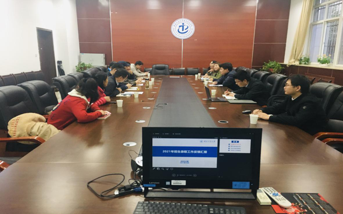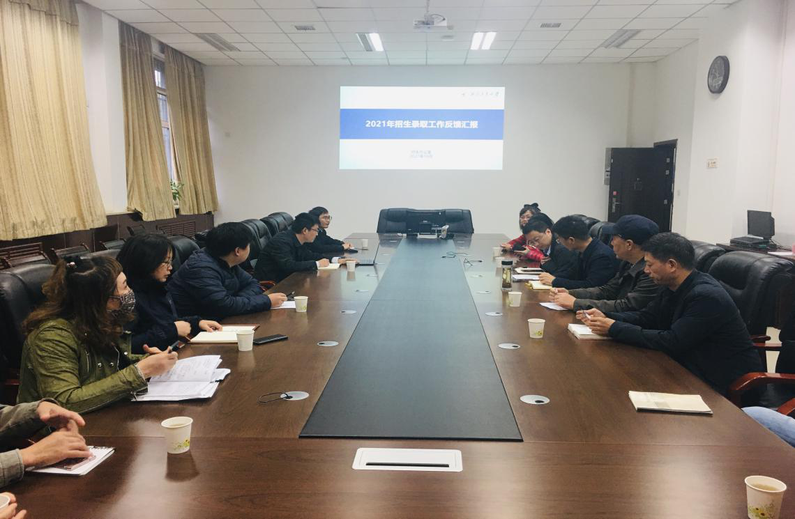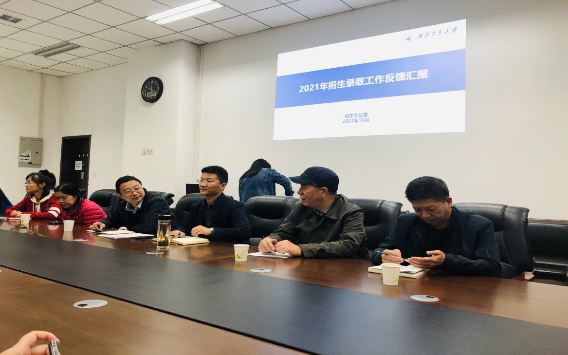 反馈会开始,彭亮代表学院对招办一行表示欢迎。招生办张懿鑫老师介绍了2021年英国上市公司官网365负责的浙江省、贵州省和咸阳地区的招生录取情况,以及招生组的日常和集中外出阶段招生宣传工作情况,指出学院所负责的“两省一市”的招生位次在2021年稳中有升。