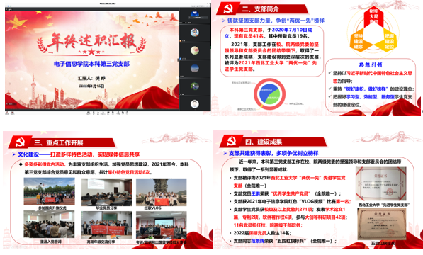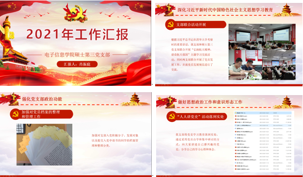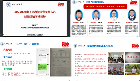 最后,侯俊对参会的各位评委老师和学生党支部书记表达感谢,对各位学生党支部书记在过去一年的工作表示充分肯定,也希望各党支部书记能够利用好这次互相学习、互相借鉴的机会梳理解决好支部目前存在的问题与不足,然后对大家即将在2022年的工作提出了三点要求:一是希望大家能够提高政治站位,加强理论学习,发挥好党员的先锋模范作用,带领党支部不断创优争先,争取“更上一层楼”;二是希望大家能够充分调动支部成员的主动性和积极性,将党建与科研学习紧密结合起来,以高质量的党建引领学风建设;三是希望大家能够充分结合自身所在支部的实际情况,不断创新支部开展活动的形式,提升党建工作质量。