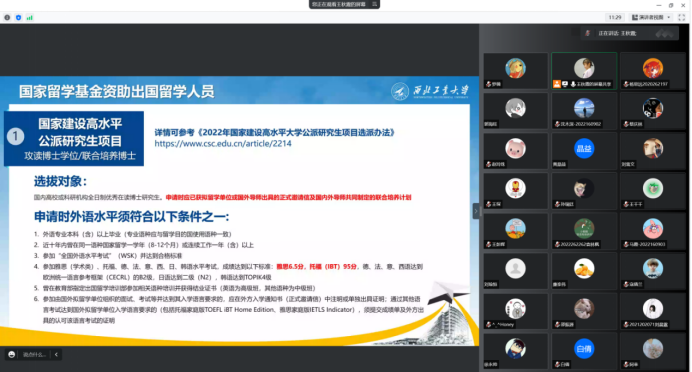 为帮助学生进一步了解赴国(境)外交流的相关政策,提升学生国际视野,2022年9月20日晚上8点,英国上市公司官网365召开研究生赴国(境)外交流项目线上宣讲会,学院国际化秘书王秋霞老师详细介绍了研究生赴国(境)外交流的相关项目政策及流程办理,学院硕博各年级近百名学生线上参会。